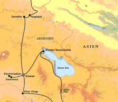 Heute erfolgt die Fahrt zur Grenze (Bus- und Reiseführerwechsel bei Grenzübertritt). Durch grüne Schluchten und Hochplateaus, in die sich der Gebirgsfluss Debed in die Landschaft eingeschnitten hat, geht es zunächst zu den als Weltkulturerbe geschützten Klöstern von Sanahin und Haghpat aus dem 10. bzw. 13. Jh. deren Architektur und Bibliotheksräume beeindrucken. Im benachbarten Dorf wird Ihnen zum Mittagessen ein Schaschlik gereicht. Danach Weiterfahrt über den 2.378 Meter hohen Spitak-Pass, zu einem Dorf, das geschützte Minderheiten des Landes beheimatet. Weiter besuchen Sie auf Ihrem Weg durch die “Armenische Schweiz“ eine Großbäckerei, die das traditionelle Brot “Lawasch“ herstellt. Weiterfahrt nach Eriwan.