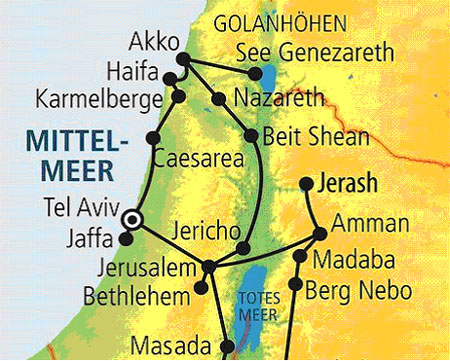 Unsere große Rundreise durch das Heilige Land bedeutet eine Reise zu den biblischen Stätten und Sehenswürdigkeiten auf beiden Seiten des Toten Meeres in Israel und Jordanien. Zunächst beginnen Sie mit den Besichtigungen an der Mittelmeerküste zwischen Tel Aviv, Haifa und dem historischen Kreuzritterhafen von Akko, bevor es in Israels grünem Norden an die Ufer des Sees Genezareth geht. Durch das fruchtbare Jordantal gelangen Sie weiter zur einzigartigen Hauptstadt dreier Weltreligionen nach Jerusalem. Am tiefst gelegenen Punkt der Erde geht es weiter entlang des Toten Meers nach Jordanien. Wie einst Moses werden Sie von den Anhöhen der gegenüberliegenden Uferseite des Salzsees auf das Gelobte Land blicken. Nach dem Besuch der historischen Stätten des Nordens rund um die Hauptstadt Amman stehen mit der Felsenstadt Petra und dem Naturwunder des Wadi Rum in der Wüste zwei weitere Höhepunkte auf dem Programm. Schließlich führt Sie die Reise zurück nach Israel, wo Sie einige Tage der Erholung am Roten Meer im Badeort Elat genießen und auf dem Rückweg nach Jerusalem und Tel Aviv die Festung von Masada besuchen werden. Eine umfangreiche, zweiwöchige Erlebnisreise mit Tagen zum Ausspannen im Heiligen Land.