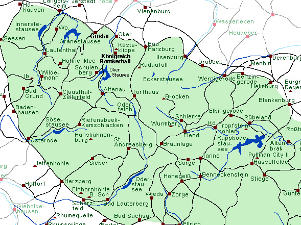 | So finden Sie das kleinste Königreich der Welt: Das Königreich Romkerhall liegt im Herzen von Deutschland, dem Harz. Wenn Sie aus Richtung Norden, Westen, Süden oder Süd-Osten mit dem Auto / Reisebus anreisen, fahren Sie am besten die Bundesautobahn A7 bis zur Ausfahrt Seesen. Von dort aus sind es noch ca. 45 min Autofahrt durch den wunderschönen Harz. Sie kommen direkt über Clausthal Zellerfeld zum Königreich Romkerhall. Wenn Sie aus Richtung Osten oder Nordosten anreisen, empfiehlt sich eine Fahrt über Bad Harzburg / Goslar in Richtung Oker und von dort aus weiter in Richtung Clausthal Zellerfeld. Von Oker aus sind es nur noch 3 - 4 km bis zum Königreich. Aber auch mit Bahn und Bus sind wir bequem erreichbar. Sie können mit der Bahn bis Goslar, Bad Harzburg oder Altenau reisen und von dort aus mit dem Regionalbus direkt zum Königreich gelangen. |