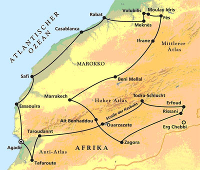 Unsere große Marokko Rundreise verbindet den Besuch der historischen Königstädte der alten Kalifen zwischen Marrakesch und Fès mit den Landschaften der Wüste und ihren malerischen Kasbahs und üppigen Oasen im Süden. Die Reise verläuft dies- und jenseits der gewaltigen Gebirgszüge des Hohen Atlas, der die Trennlinie der beiden Programmteile darstellt. Im Mittelpunkt steht ein dreitägiger Aufenthalt in Marrakesch, der wohl schönsten und aufregendsten Residenzstadt des alten Königreiches. Hier erleben und genießen Sie ausführlich das quirlige Treiben zwischen Tradition und Moderne. Zauberhafte Gärten, Plätze und Paläste mit der typisch marokkanischen Architektur rund um die Medina und den zentralen Platz Djemaa el-Fna gilt es zu entdecken.