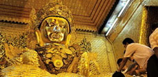 In Mandalay besuchen wir die berühmte Mahamuni Pagoda, mit ihrer fast 4m hohen Buddhastatü, dick mit Goldblättern veklebt.