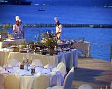 Am privaten Strand liegt ein exklusives Fischrestaurant. Ein weiteres Restaurant