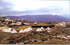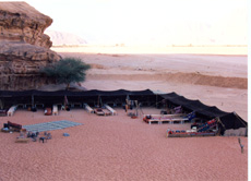 Im Wadi Rum, beim staatlichen Rasthaus, gibt es ein Camp mit sanitären Einrichtungen. Es stehen kleine Zelte und ein großes Beduinenzelt für die Übernachtung zur Verfügung.