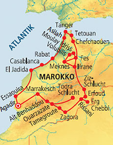 Von den Oasen des Südens gelangen Sie über den Hohen Atlas zur berühmten Ziz-Schlucht. Weiter über den Mittleren Atlas und die Stadt Midelt fahren Sie zu dem Kurort Ifrane und unternehmen einen Spaziergang durch